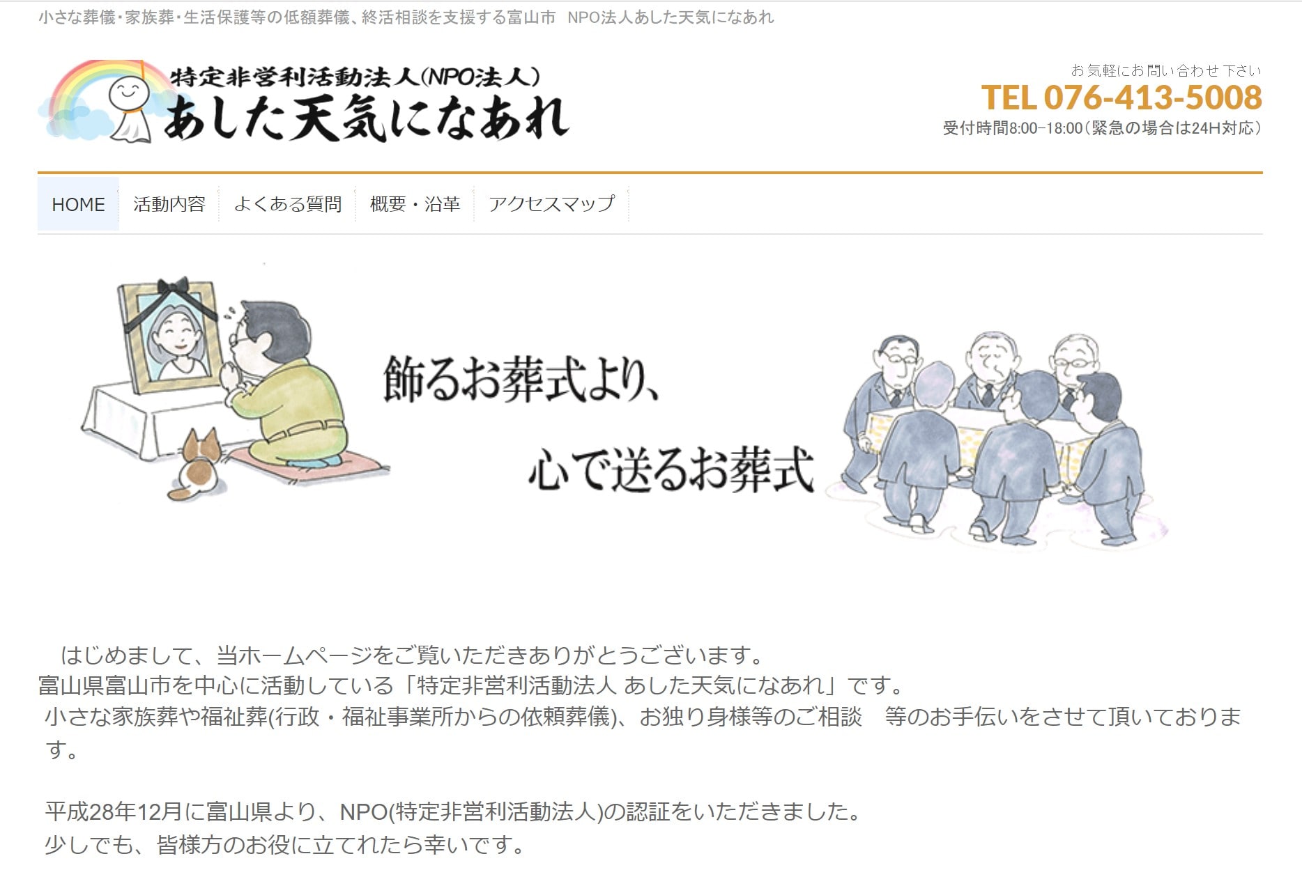 あした天気になあれは、身寄りのない人や生活保護受給者、施設入所者等の社会的弱者の葬祭の援助をはじめとして、老後、終焉そして死後の為の相談・支援事業を行い、社会福祉の増進に寄与することを目的とする。