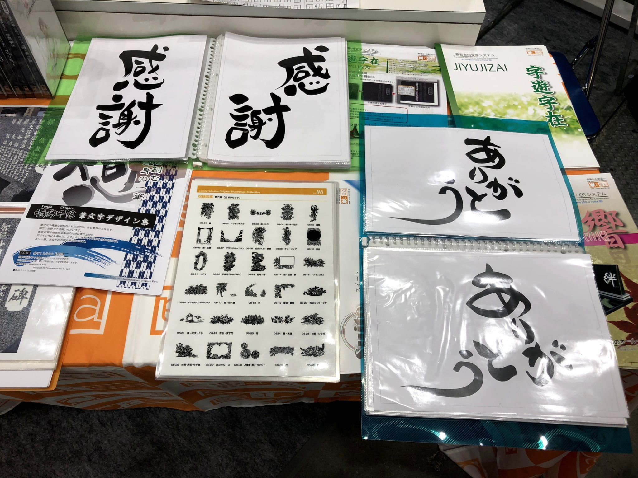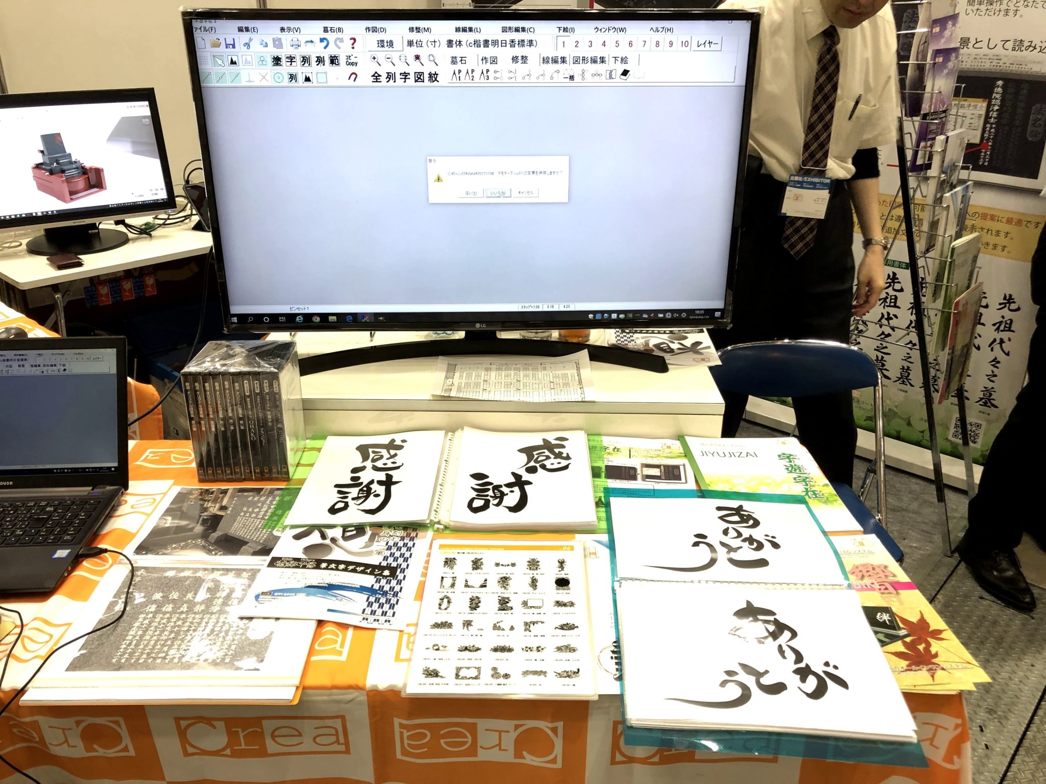 今回のイベントで大きく取り上げているのは、石材店用のソフトウェアである。図面の作成・CG作成や部材加工書・見積書作成に対応した墓石CAD・CGシステム『雅』や顧客管理システム『十八番』、書家が実際に描いた作品を使用した墓石専用文字システム『字遊字在』など、墓石作成に必要なソフトウェア全般を取り扱っている。また、これらをまとめたパック「suite(スイート)」も発売されている。石材店や、葬儀社の石材部門をターゲットに、今回のブースを展開している。