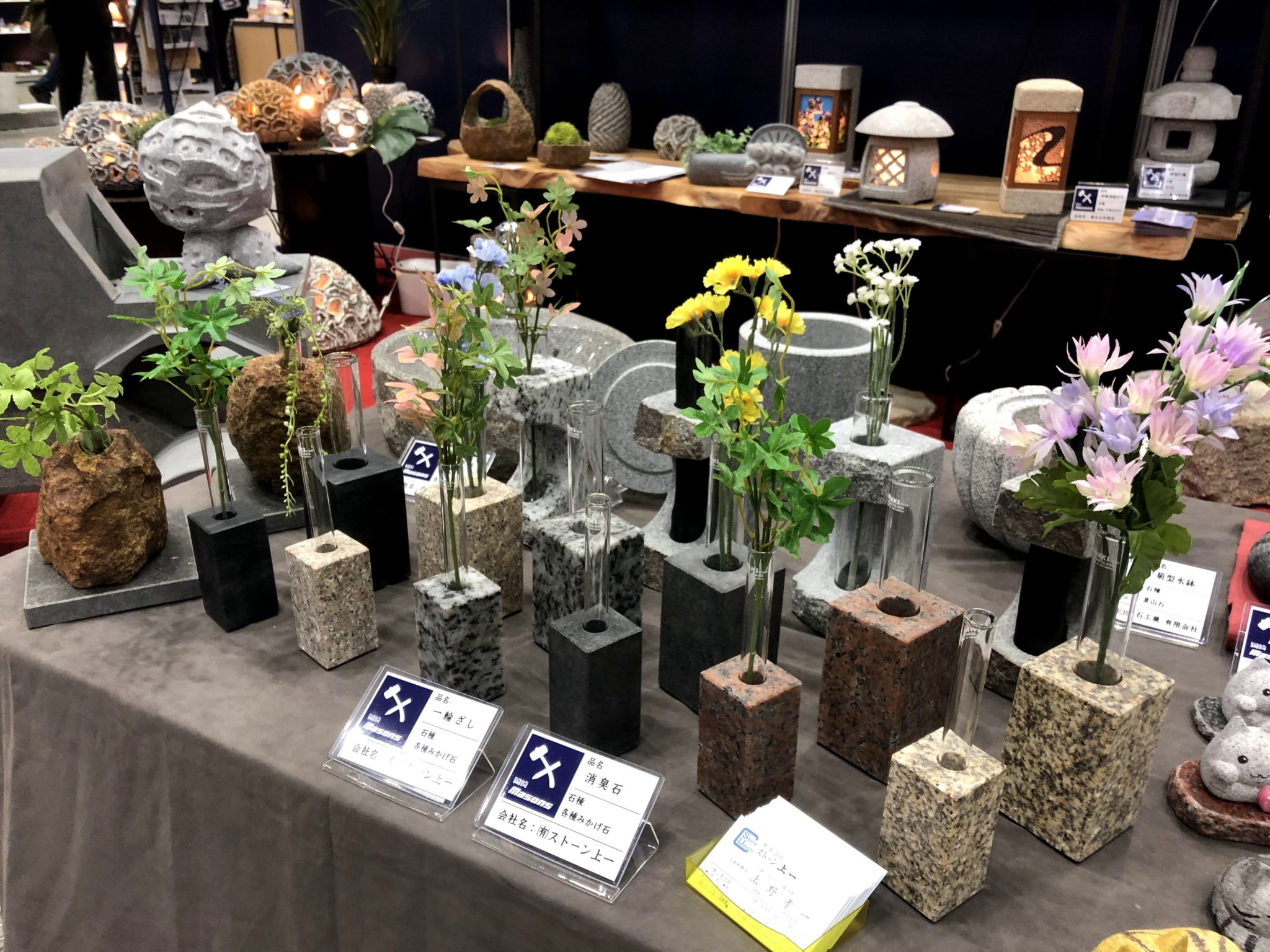 今回のブースで大きく打ち出したのは、役目を終えた墓石などをリメイクして新しく生まれ返させる『Remember』だ。墓をそのままにはしておけないけれど、全て無くなってしまうのは寂しい、偲びないという想いに応えるために作られた。 リメイク後はペットの置物や花器などに生まれ変わる。工場では作業工程の写真が収められながら作業が進められるので、完成品が確かに施主の石から作られているということが実感できる仕組みになっている。