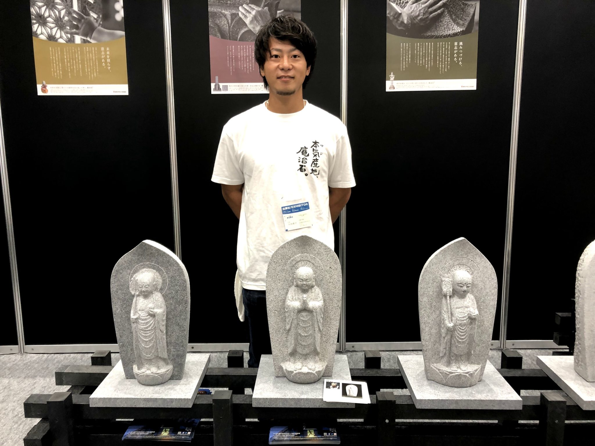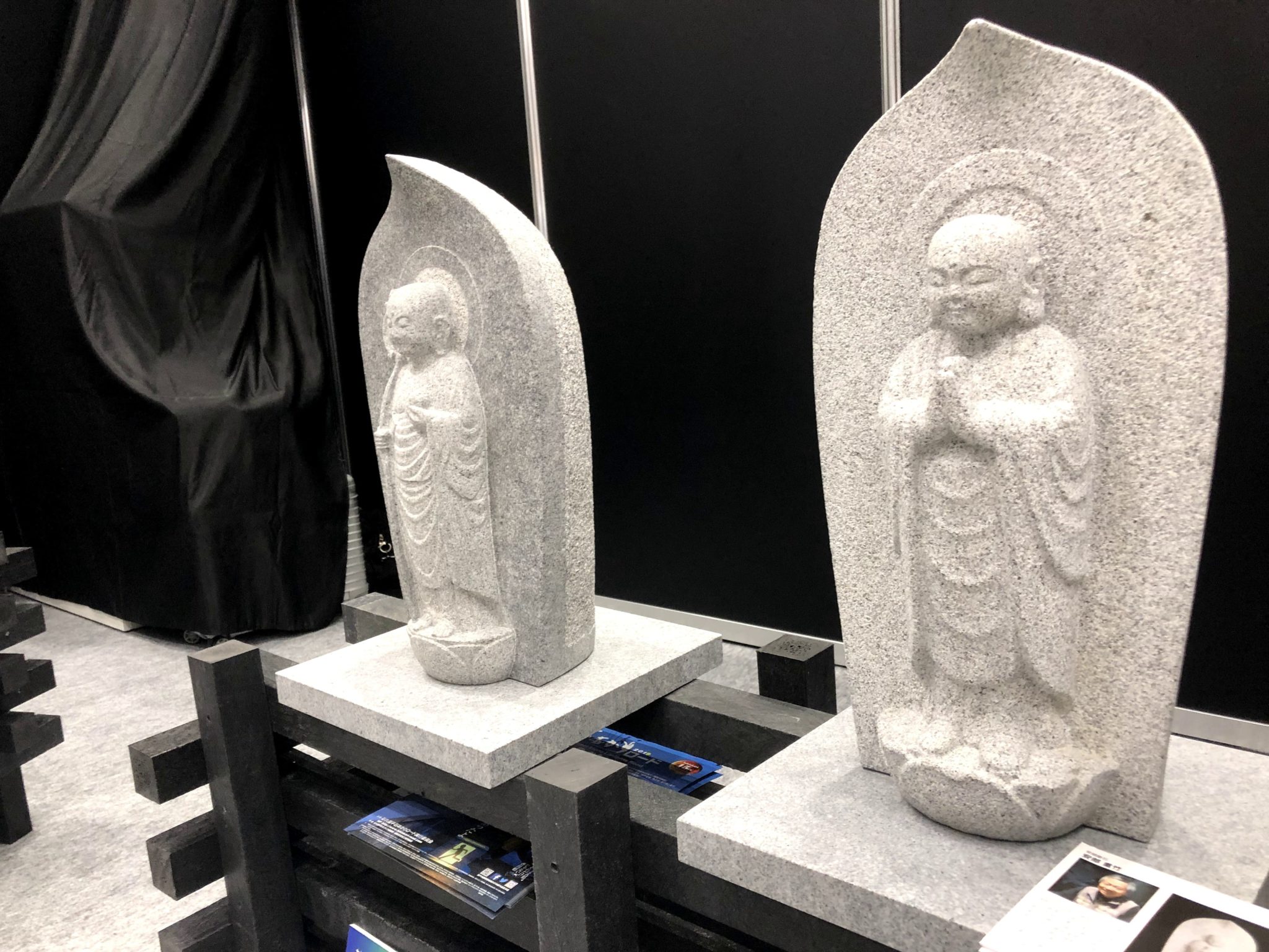 今回のブース出展は、庵治石のPRが目的だ。 会場には、地蔵の作品と製作者の顔と紹介文が並置されている。彫石師によって顔や衣服の表情が異なるのがよくわかる。「この人に作ってほしい」と、見る人からオーダーメイドで依頼が来ることもあるのだという。庵治石の硬くも彫りやすい特質が、彫石家の個性をより引き立たせている。