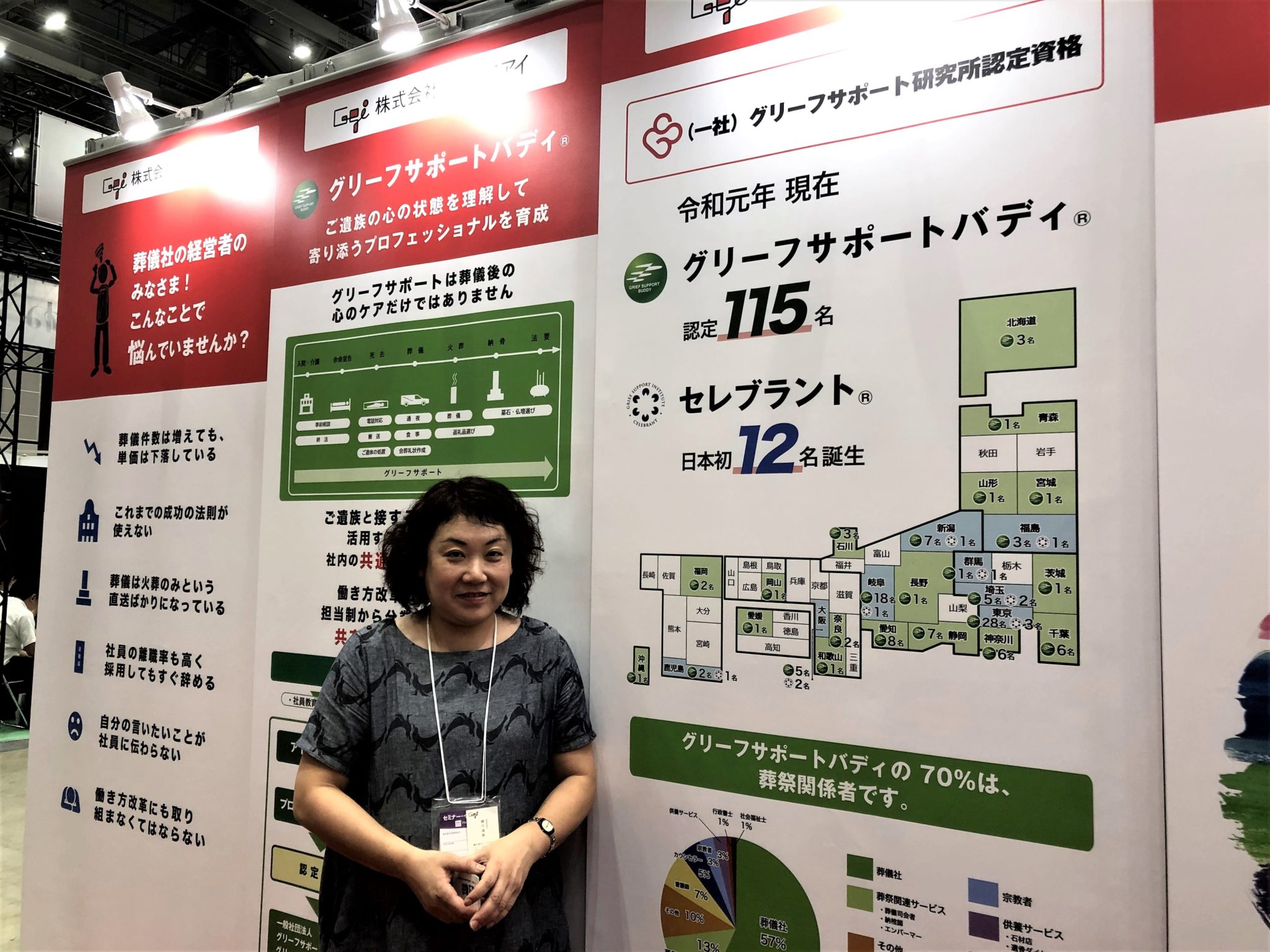 今回の展示会で特に打ち出しているのは『グリーフサポート』だ。型通りでなく、残された人の想いを汲みとった葬儀をプランニングできる葬儀関係者に贈られる『セレブラント』、残された人の心に寄り添える人に贈られる『グリーフサポートバディ』の二つの認定制度を立ち上げ、セミナーを開いて技術の習得を推進している。