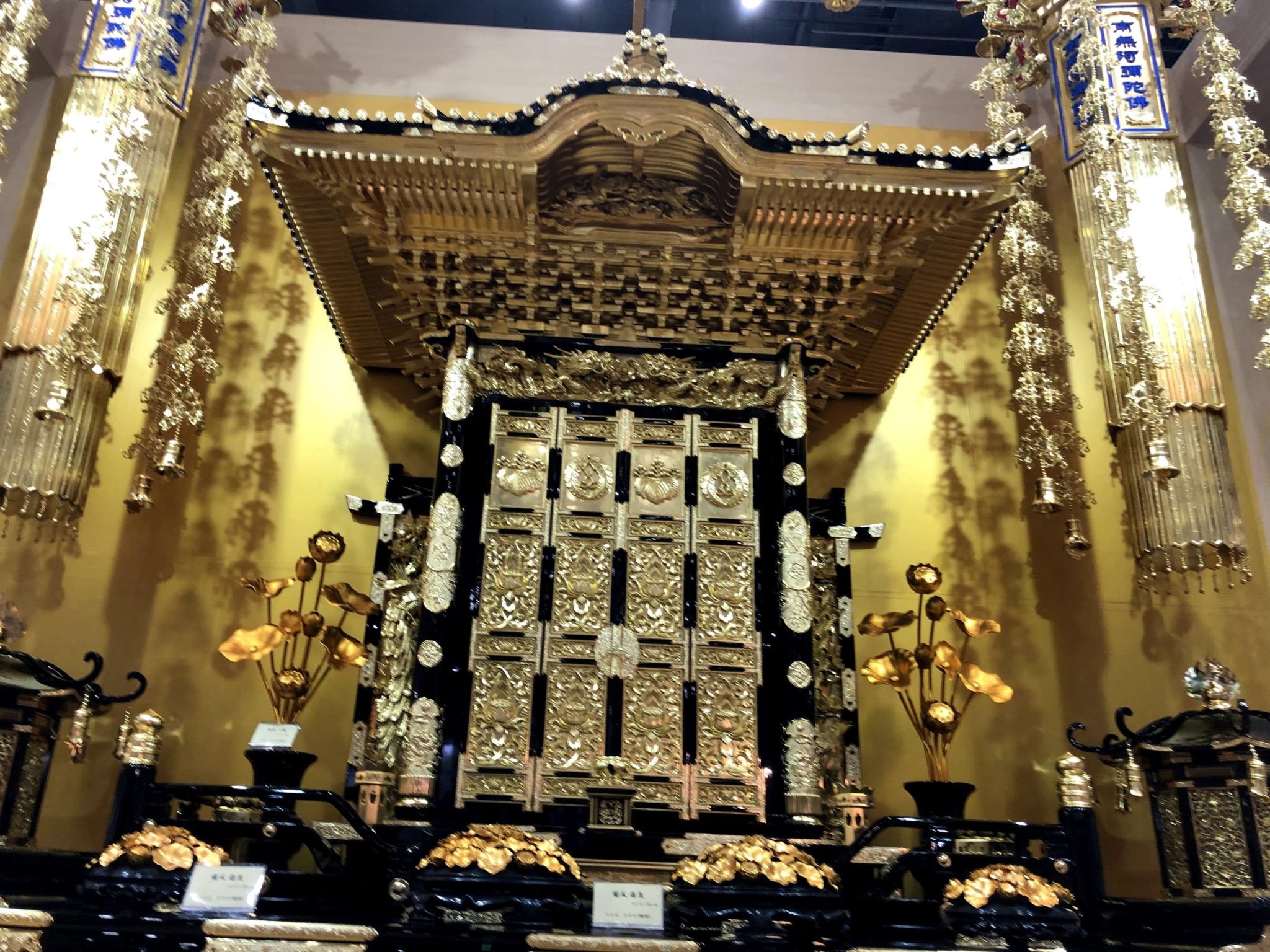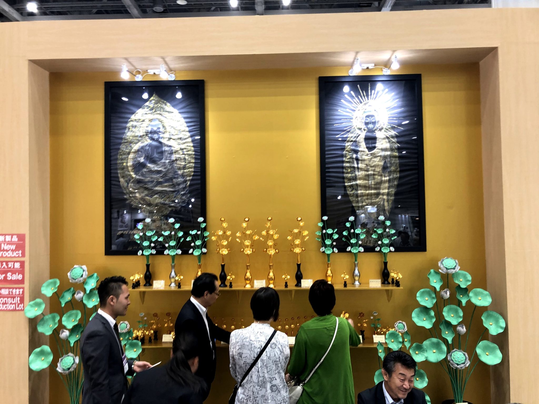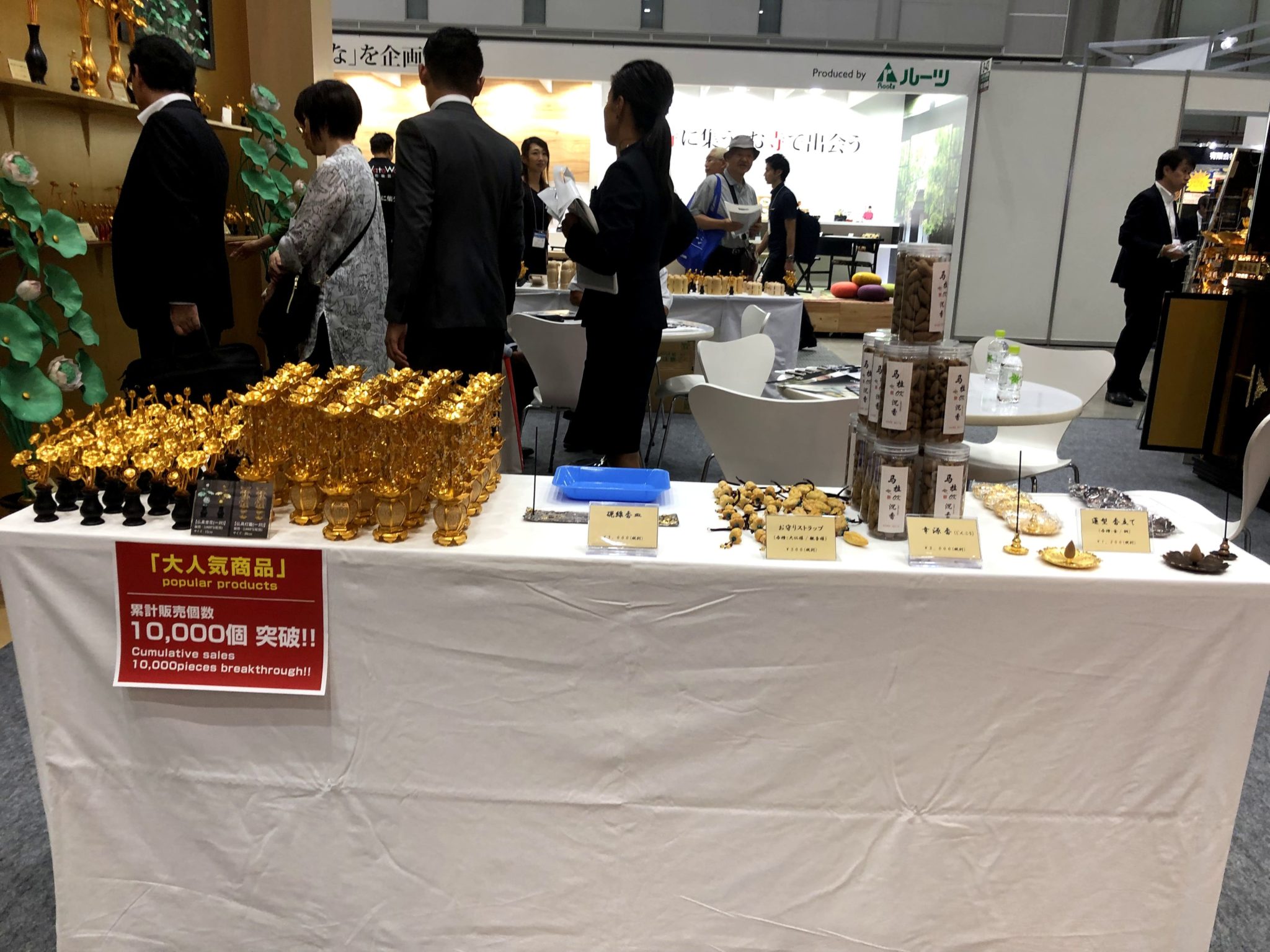 今回のイベントで注目なのは、ブースの中央に設置された荘厳な宮殿(くうでん)だ。他企業よりも値段は低くおさえられていることが特徴だ。他にも累計販売個数10000万個を突破した灯篭なども注目の商品である。