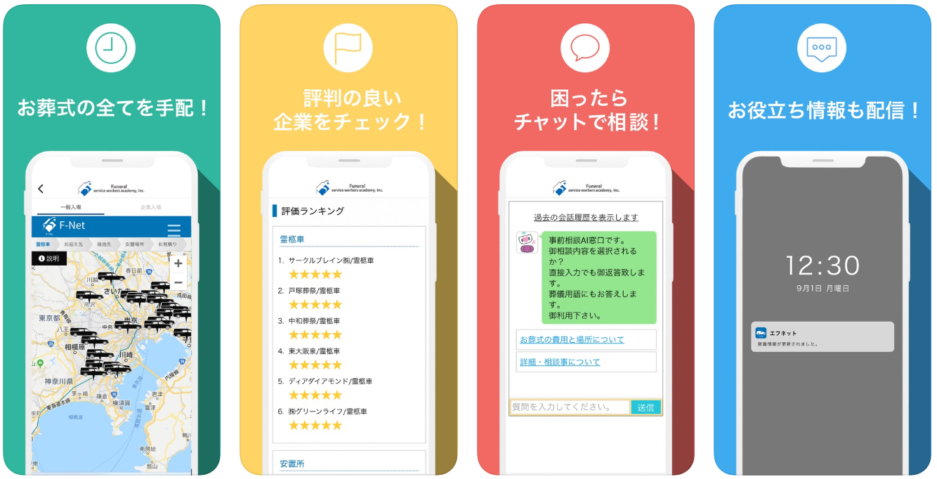 お葬式アプリ F-Net (エフネット) Funeral Service workers academy, Inc.は、お葬式の全てをアプリで手配することができるアプリ「F-Net」(エフネット)を運営する会社である。エフネットは、霊柩車・安置所・葬儀場・宗教家・墓地等を一括で手配することができるアプリである。このアプリを利用すれば、あらゆる葬儀に関する手配をスマートフォンで完結することができるという利便性がある。また、霊柩車・安置所・葬儀場等の事業者も、このアプリを利用することで運営効率を上げることが可能である。