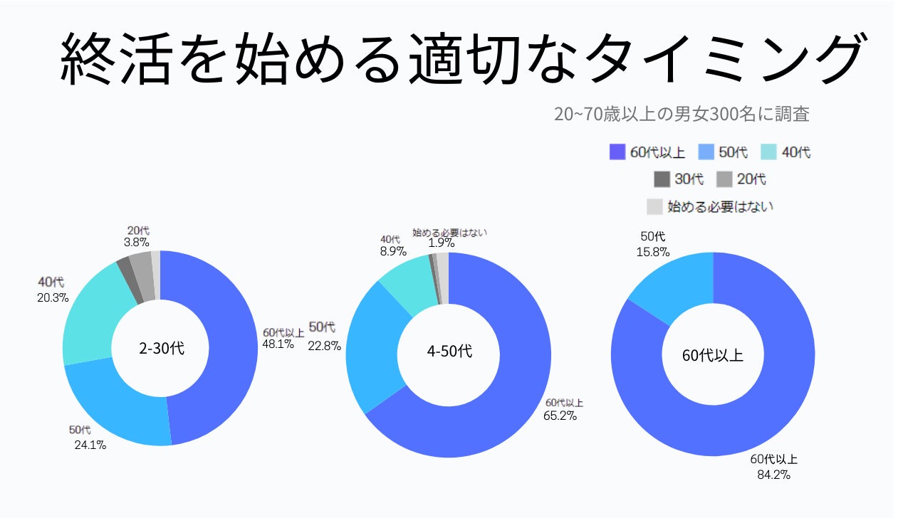 また、終活を始める適切なタイミングについて年代別に見ると、2~30代でも「40代のうちに始めるべき」と考える人が20.3%の結果となりました。40代でも8割以上の人が「50代以降に始めるべき」と考えています。