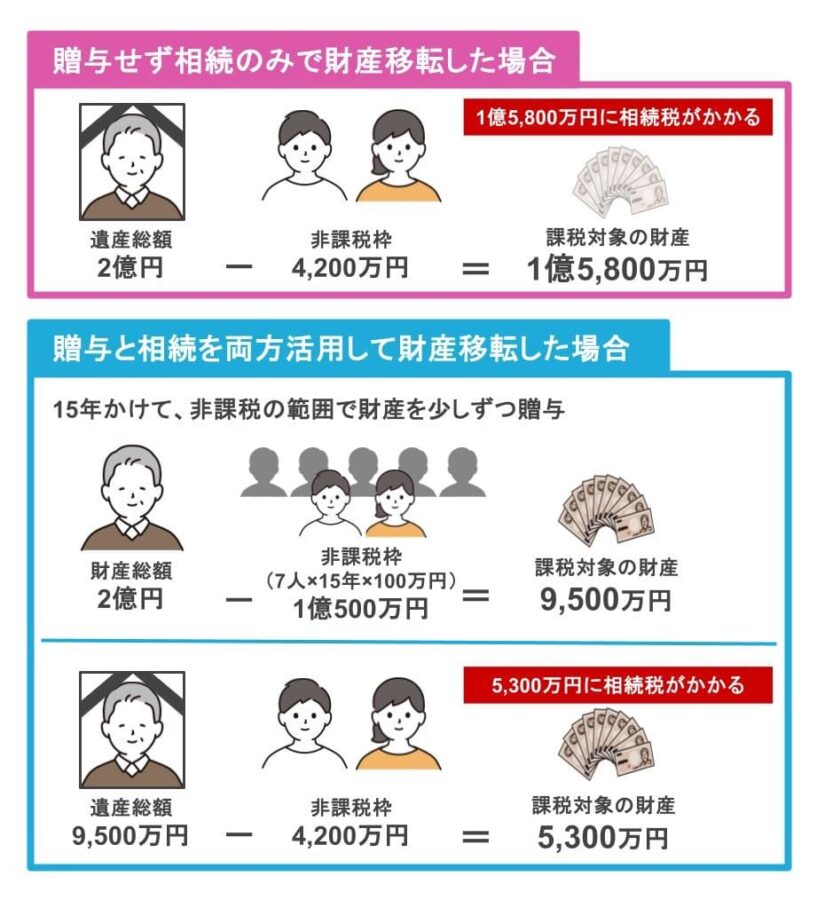 時間的な余裕がある場合、つまり財産を持つ方が比較的若く健康なうちから計画的に財産を移転したい場合は、贈与が有効です。前述したように、年間110万円の贈与には贈与税がかからないため、長期間にわたって無税で財産を移転でき、結果的に相続時の税負担を大幅に減らせます。