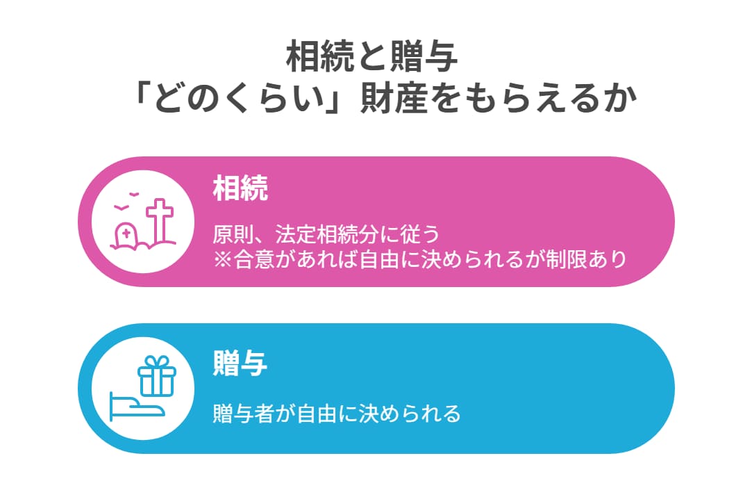 このように、相続では法律で決まった割合を中心に取り分を決めていくのに対して、贈与では金額を自由に決められるという違いがあります。
