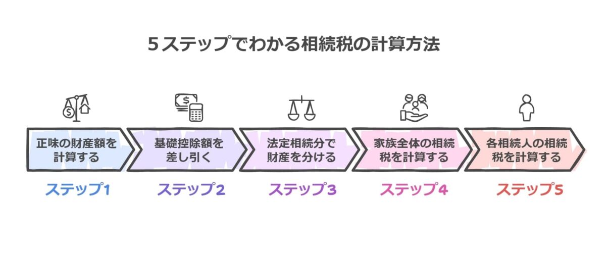 ここからは、相続税の計算方法を5つのステップに分けて紹介します。複雑に感じるかもしれませんが、以下の流れで順を追って見ていけば、相続税の計算方法を十分理解できます。